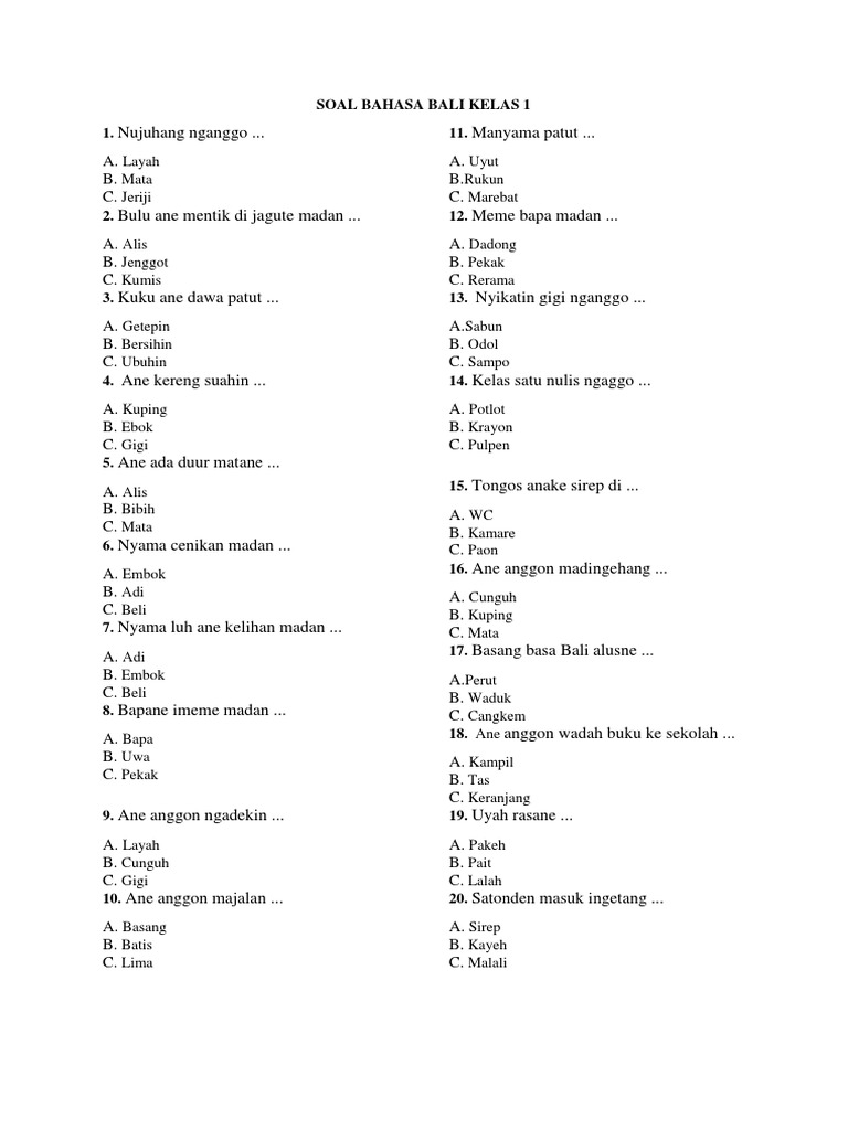 Ulangan mid semester bahasa inggris kelas vii. Terobosan yang dilakukan yakni dengan penyusunan buku pedoman bagi para guru dalam mengajarkan bahasa bali kepada siswa sd kelas iv, v dan vi. Digunakan sebagai buku teks utama pelajaran bahasa bali yang digunakan oleh siswa sd kelas atas (iv, v, dan vi). Kunci jawaban lks bahasa jawa kelas 5 semester 1. Kompetensi dasar ki 4 bahasa bali kelas 5 sd mengamati, mengolah, dan menyajikan teks laporan buku tentang tentang makanan, kesehatan manusia, keseimbangan ekosistem, serta alam dan pengaruh kegiatan manusia dengan bantuan guru dan teman dalam bahasa dan aksara bali lisan dan tulis dengan memilih dan memilah kosakata baku.